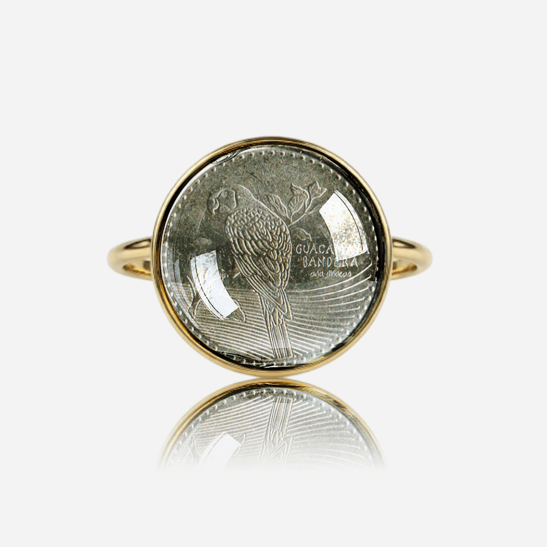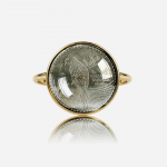 Montée sur une base en laiton doré, la bague est sublimée par un cabochon, un cylindre en verre brillant à l’éclat cristallin, garantissant confort et design travaillé.