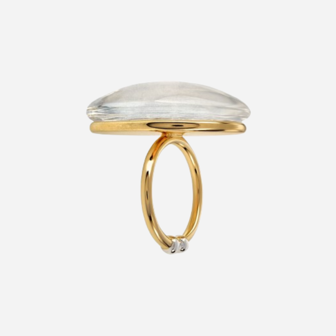 Montée sur une base en laiton doré, la bague est sublimée par un cabochon, un cylindre en verre brillant à l’éclat cristallin, garantissant confort et design travaillé.