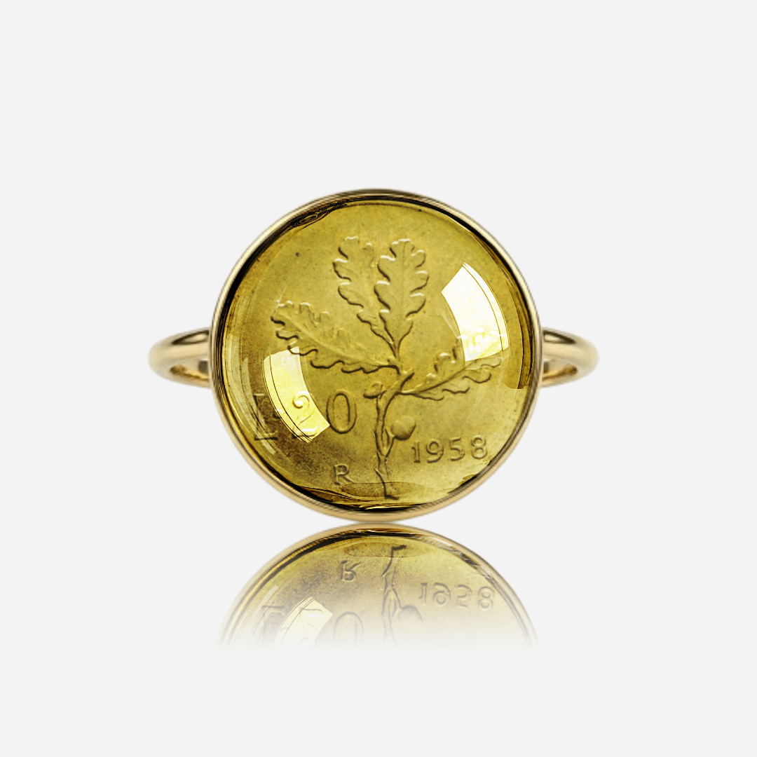 Au revers de la pièce, on voit un rameau de chêne avec gland, avec la valeur « L. 20 », date et marque « R » pour Rome. Sur la face, un buste allégorique féminin avec des épis de blé, conçu par Pietro Giampaoli.