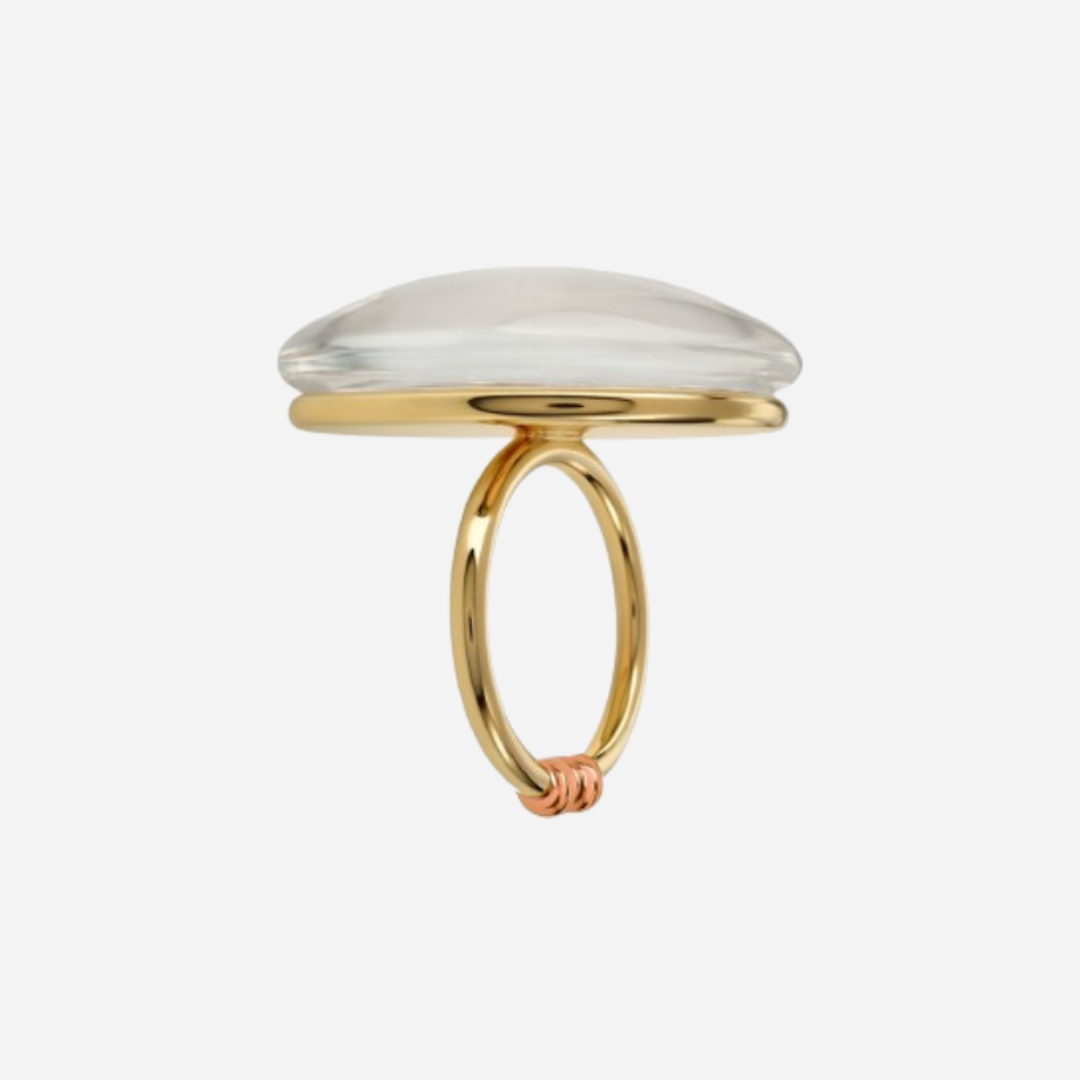 Montée sur une base en laiton doré, la bague est sublimée par un cabochon, un cylindre en verre brillant à l’éclat cristallin, garantissant confort et design travaillé.